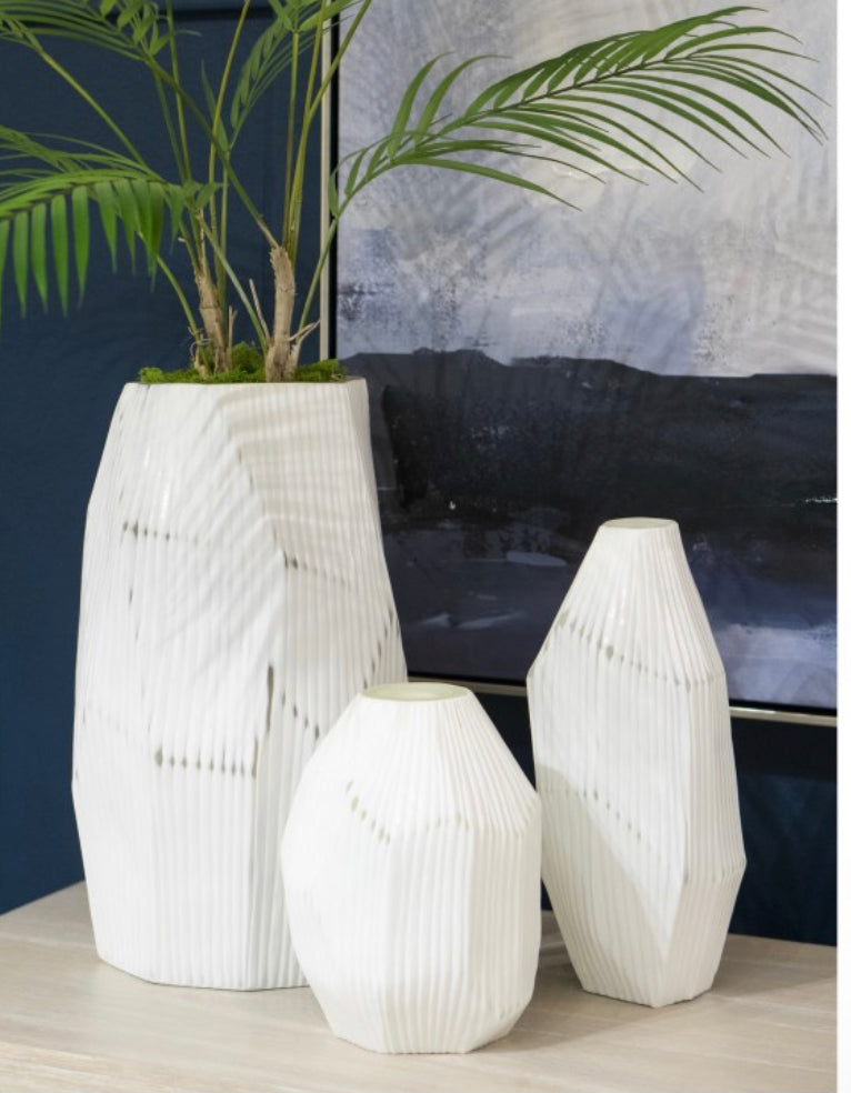 The Aggie Vase is a sculptural, faceted frosted glass vase with a matte white finish and an elongated body. This vase is perfect for a Scandinavian or coastal look. Large-9.5" W x 9.5" D x 16.25" Medium-9.5" W x 9.5" D x 16.25" Small- 6.25" W x 6.25" D x 8.75"...