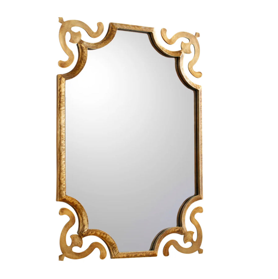 Explore a glamourous update on the traditional with this beautiful bronze mirror. Thin details and sophisticated curves dress up walls in any hallway.   Dimensions: L 35.25 X W 25.25 X H 1.50 Weight: 26.35 lbs. Finish: Brass Materials: Iron and Mirrored Glass